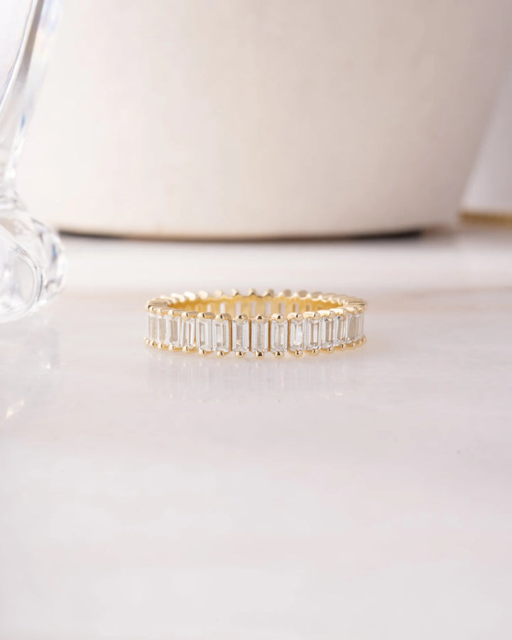 Featuring an eternity style design with stones throughout the entirety of the ring. Looks stunning in person and shines so bright! Available in Gold or Silver, Sizes 6-7.