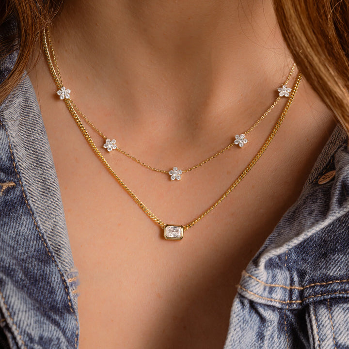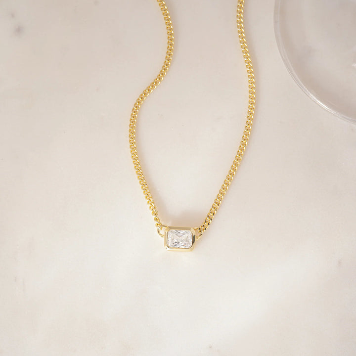 Gorgeous emerald cut stone set on a bezel setting featuring a cuban link chain. Great for stacking or worn on its own!