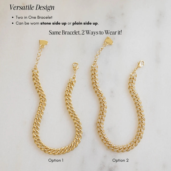 Beautiful Curb Chain bracelet featuring pavé cubic zirconia stones throughout the bracelet. Bracelet can also be worn on reverse side, where there are no stones. Very versatile and looks great worn alone or paired with other bracelets!
