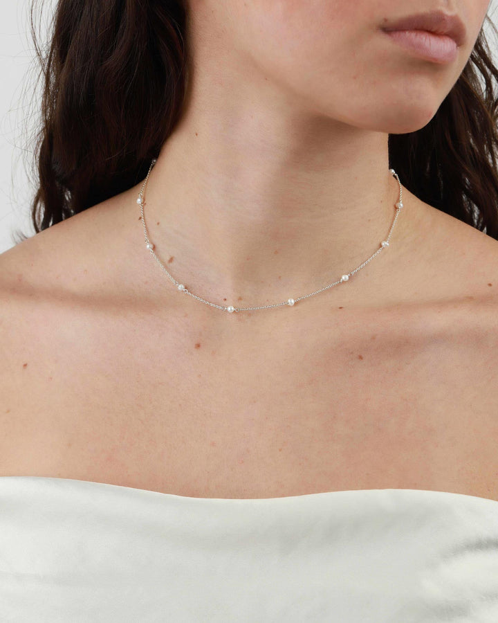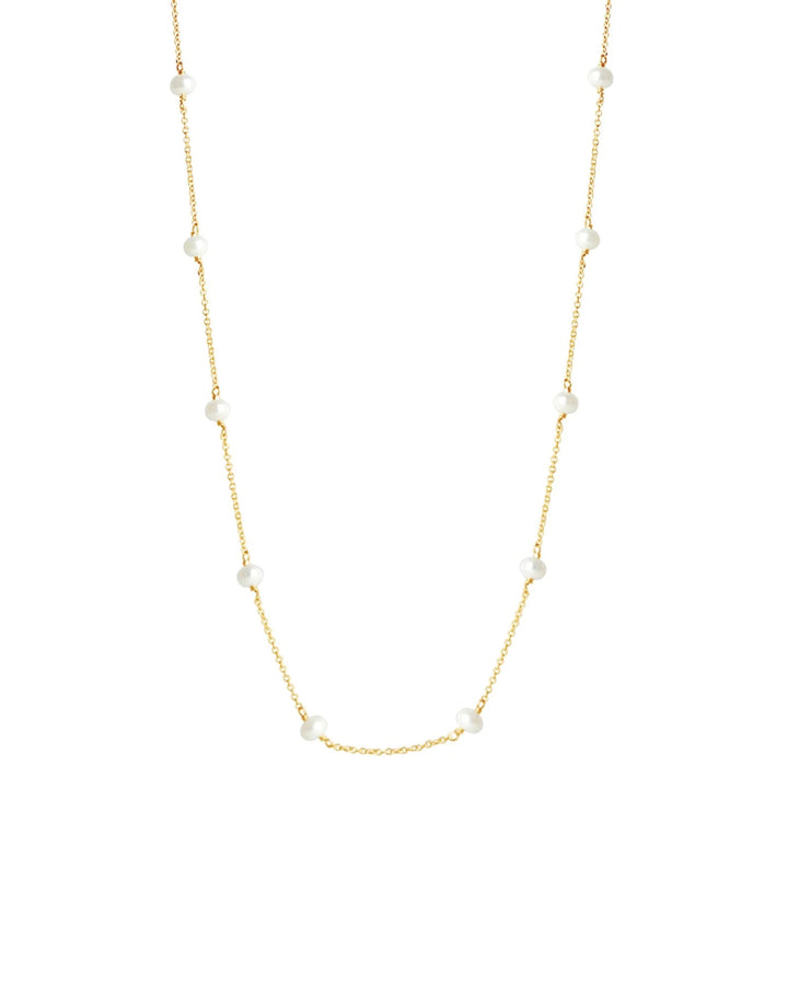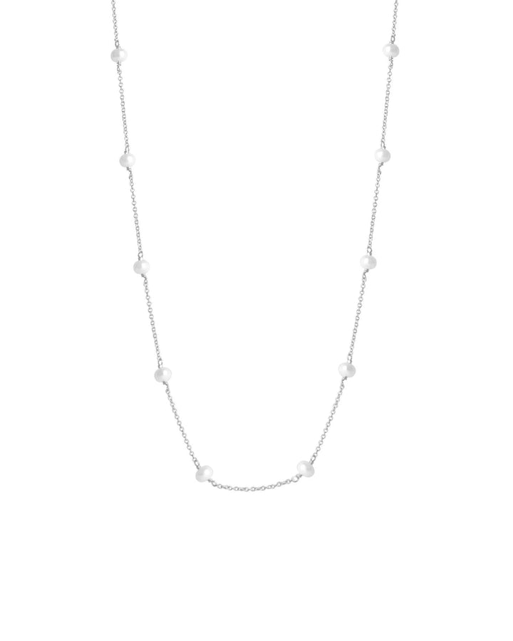 6mm simulated pearl station necklace in Silver and Gold. 1mm thick with box chain 24 Inches. Spring ring clasp.