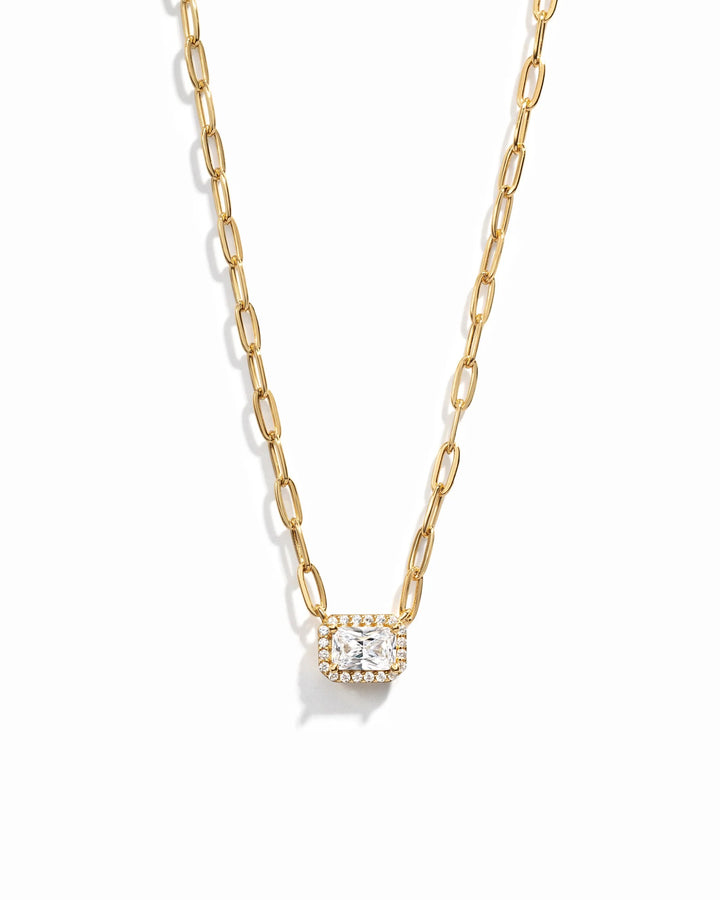 This paperclip chain necklace combines timeless charm with a fresh edge. The halo baguette pendant adds a feminine sparkle, while the paperclip chain keeps it casual, perfect for everyday wear. A must-have minimalist necklace to add to your necklace stack!