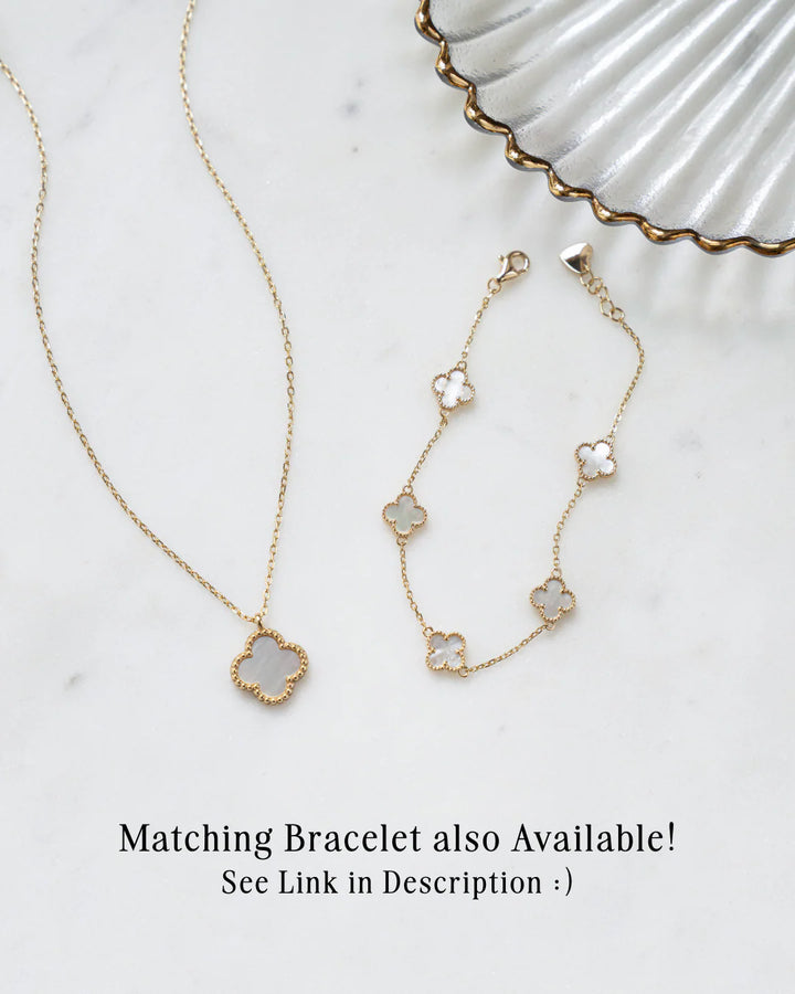 A touch of luck and timeless beauty. This necklace features a luminous mother of pearl set against a four-leaf clover pendant on a simple gold or silver chain. Wear it as a symbol of good fortune or as a versatile layering piece.