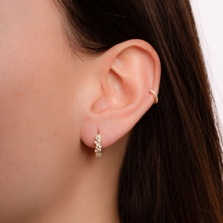 These stunning multi-stone huggies are the perfect touch to elevate any look. Featuring both baguette and round stones, this is a unique take on a classic huggie hoop. They shine so bright - they're beautiful and stylish! You will love them!