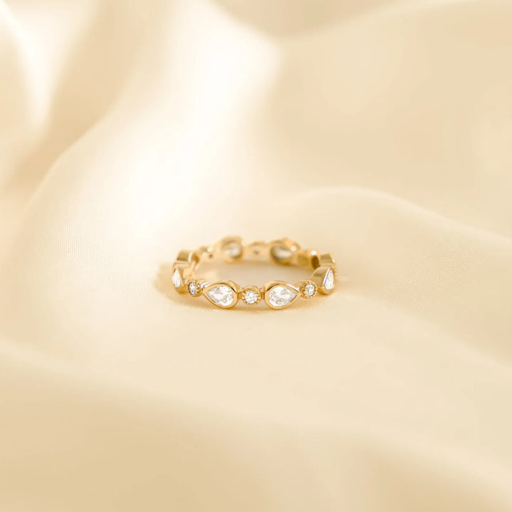A stunning mix of pear and round shaped stones, wrapped around the entirety of the band for an eternity ring style. Perfect for celebrating unforgettable moments or simply treating yourself to something special. This ring looks great stacked or on its own!