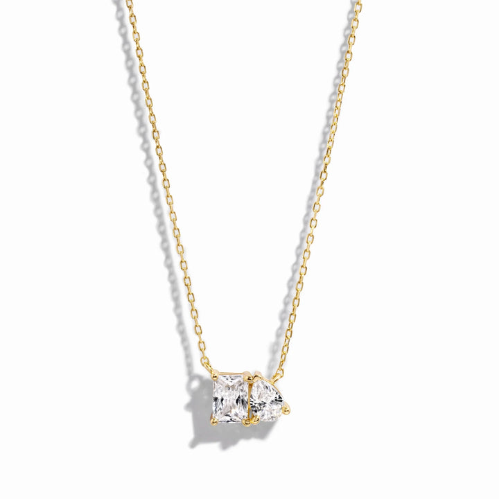 Our Toi et Moi Necklace features a radiant emerald cut stone paired with a pear (teardrop shaped) stone. This Toi et Moi necklace is a beautiful piece that means "you and me", symbolizing the unity of two people. This necklace offers double the fun, it's a statement piece showcasing two beautiful stones!