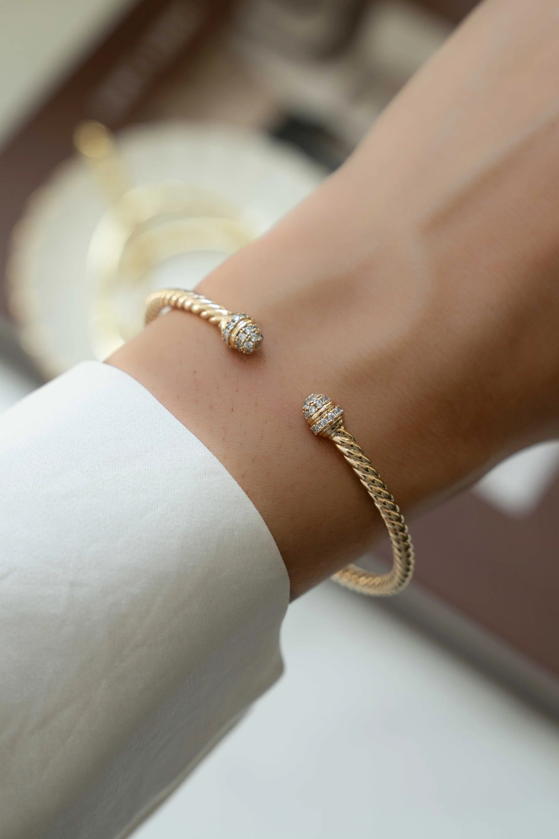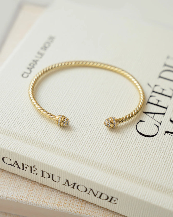 Add that luxe feel to your look with this twisted bangle cuff bracelet. This stunning adjustable bangle features a spiral design and just the right amount or sparkle! It's the perfect stackable bracelet for everyday wear. With its open cuff design and vintage inspired details, its both minimalist and timeless!